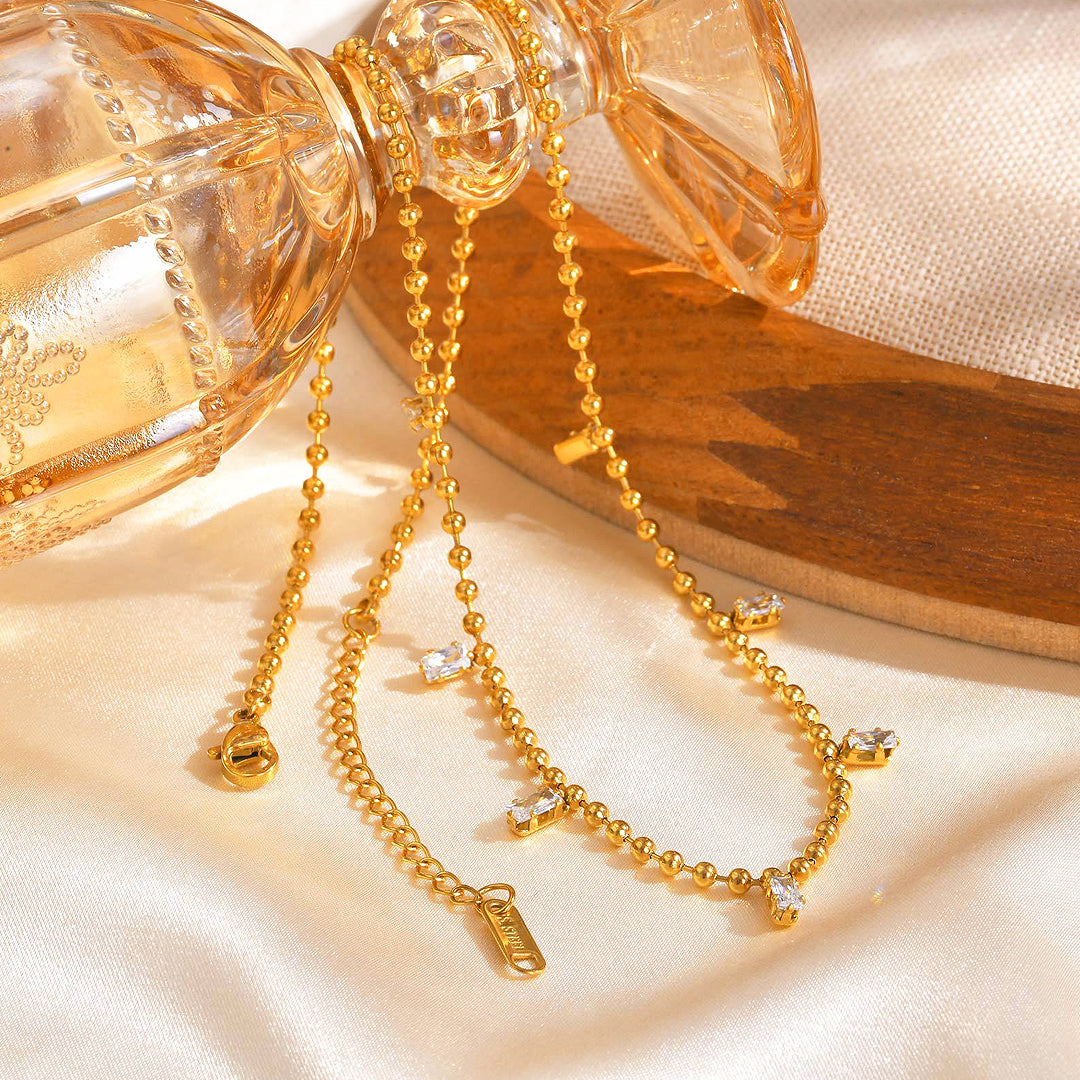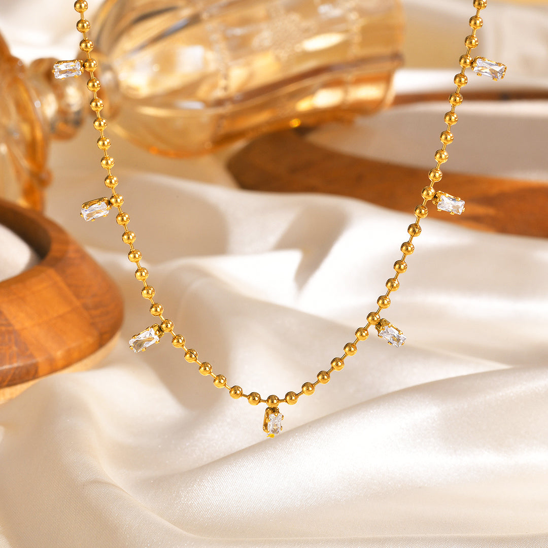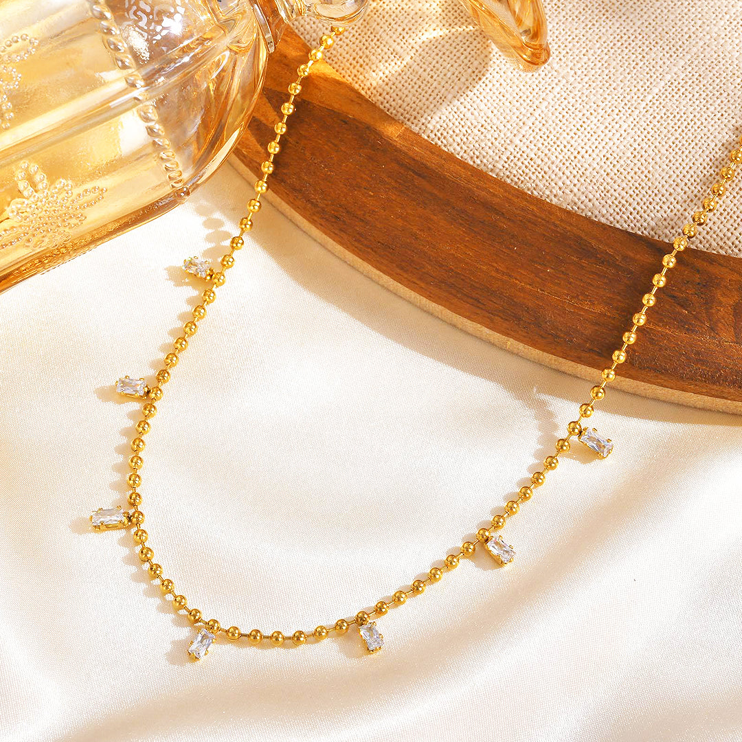 Delicate and graceful, the Luxe4412 Sparkle Drop Luxe Necklace adds a refined hint of shimmer to your neckline. Featuring a dainty beaded chain adorned with petite baguette-cut zirconia drops, each stone catches the light beautifully with every movement. Crafted from stainless steel and finished in luminous, non-tarnish gold plating, this hypoallergenic piece is made for effortless, everyday elegance.