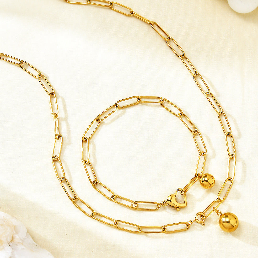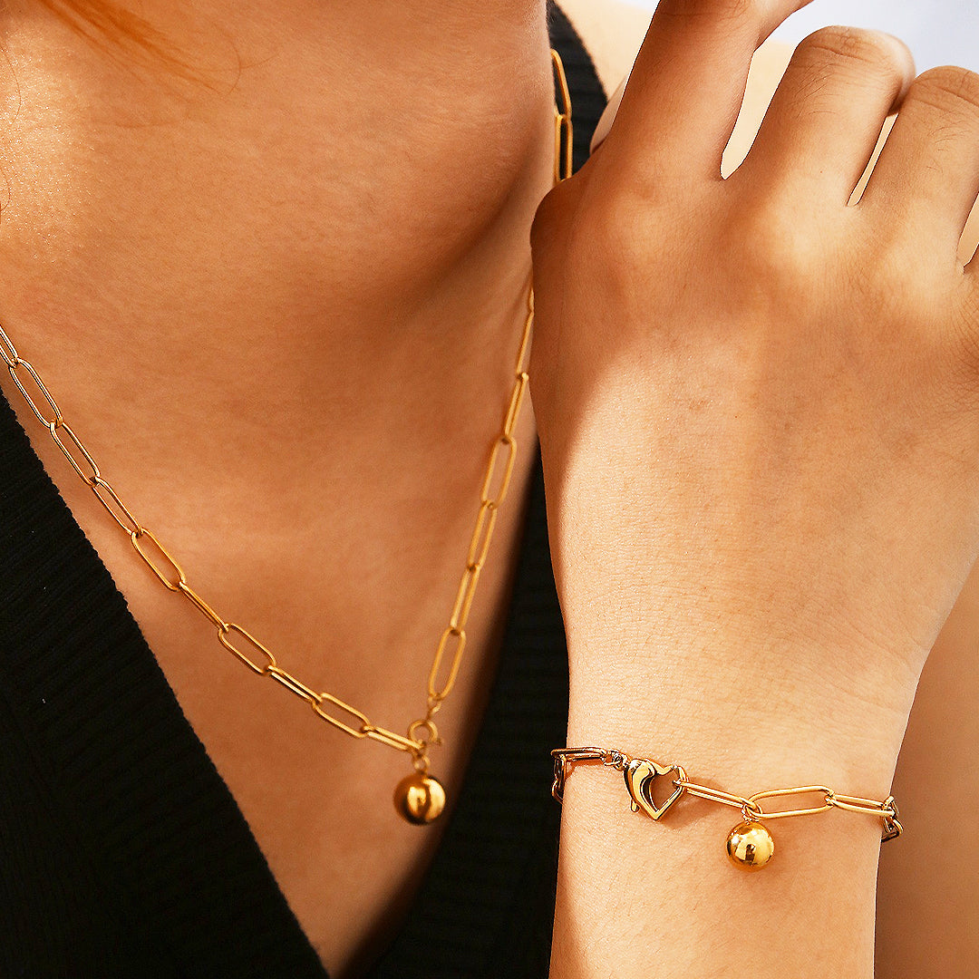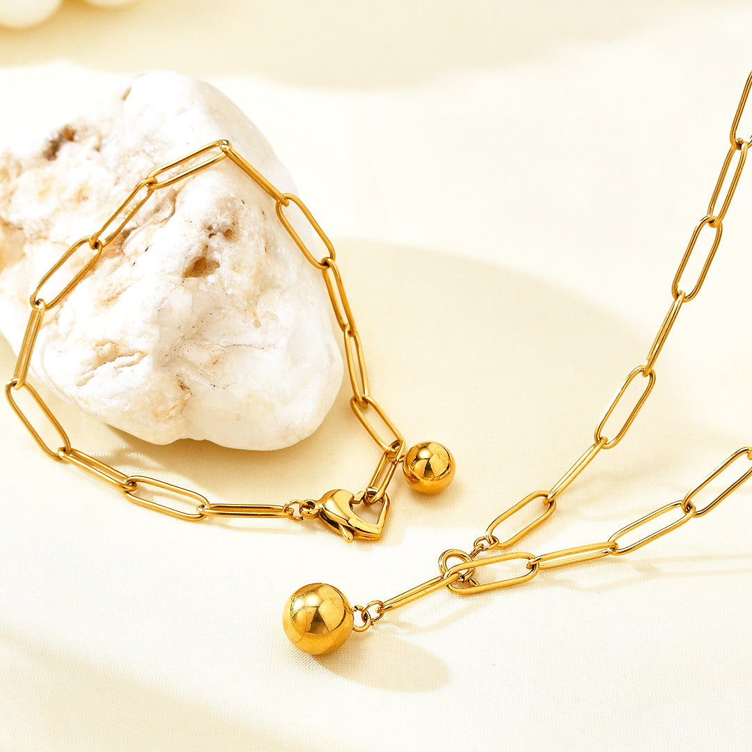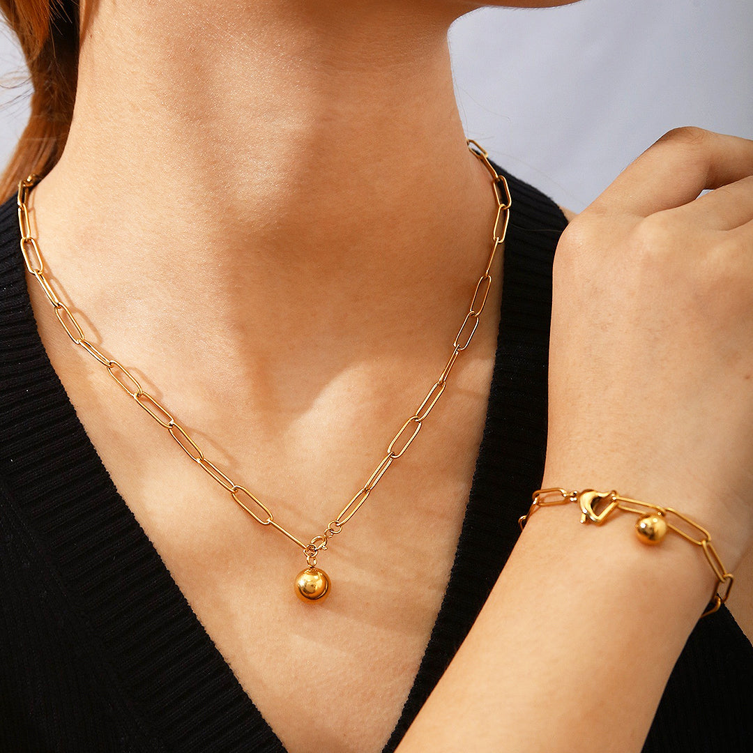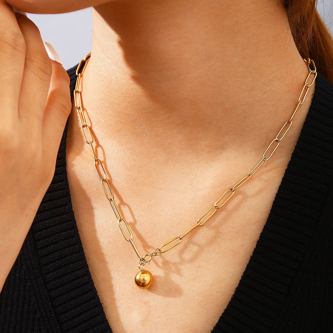Make a powerful, modern statement with the Luxe4431 Golden Paperclip & Orb Necklace. This piece perfectly balances the on-trend boldness of the paperclip chain—known for its clean, confident, geometric links—with the sleek, minimalist elegance of a perfect sphere. The smooth, polished Golden Orb drops effortlessly from the chain, creating a captivating focal point that draws the eye downward. The entire piece is finished in a luminous, rich Gold Plating, applied via a robust five-layer electroplating process that guarantees spectacular, lasting color.