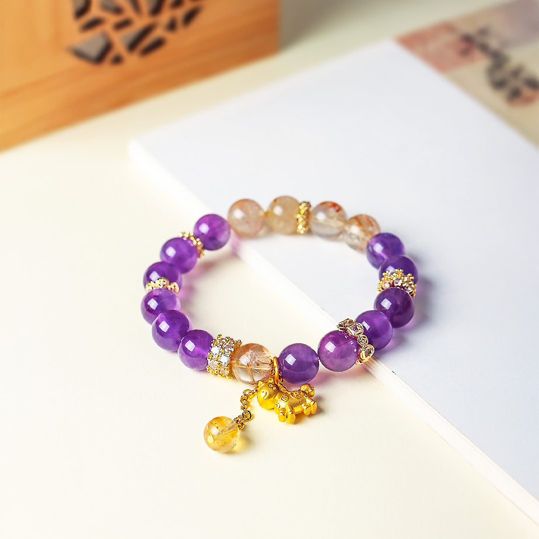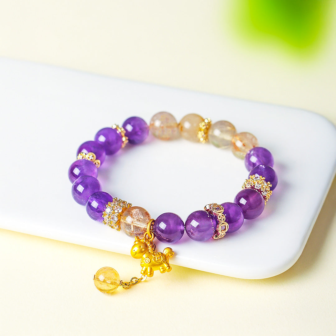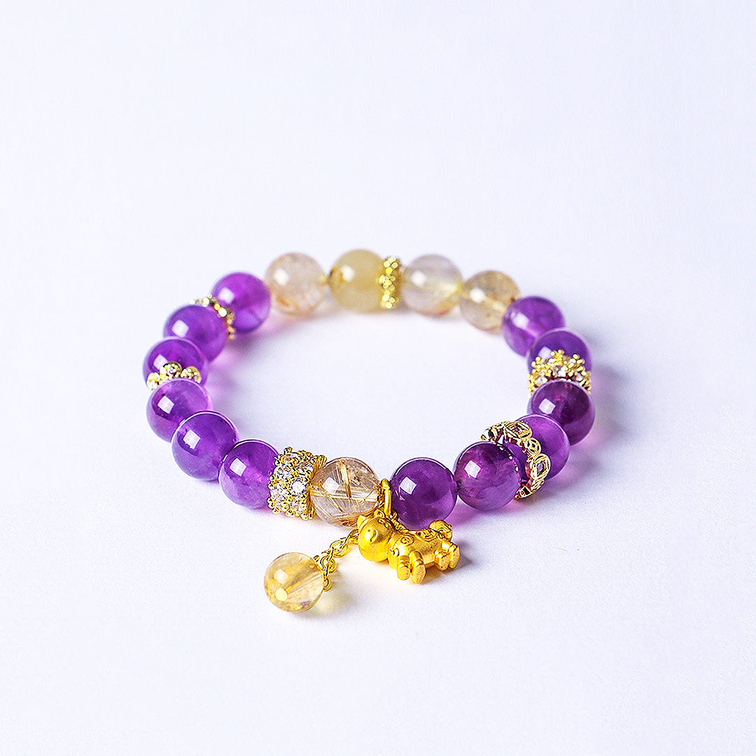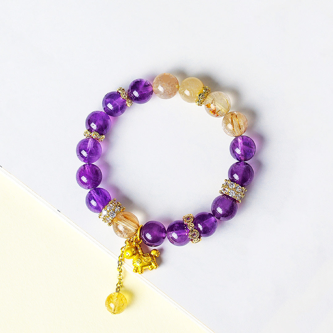 Unleash the spirit of ambition and magnetize unparalleled success with the C234 "Gallop to Fortune" bracelet, a striking piece from our 2026 Year of the Horse Collection. This captivating bracelet artfully blends the deep, regal purples of polished 10mm Natural Amethyst beads with the brilliant, golden streaks of 10mm Natural Golden Rutilated Quartz beads, creating a visual symphony of power and elegance. The luminous gold-plated Horse Charm, a potent symbol of swift progress and unwavering strength, takes center stage, flanked by sparkling crystal-pavé spacers and a delicate golden accent bead.