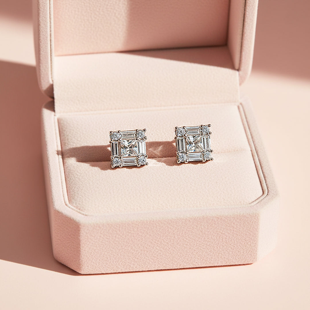 The Luxe3668 – Imperial Radiance earrings are a striking display of architectural elegance and exceptional brilliance. Designed in a refined square silhouette, a princess-cut centre stone takes focus, framed by precisely arranged baguette and round cubic zirconia that create a structured, multi-dimensional halo. The geometric symmetry enhances the sparkle, allowing light to reflect from every angle with breathtaking intensity. Each stone is meticulously set to achieve flawless proportion, delivering a radiant, diamond-like shine that commands attention without overwhelming.